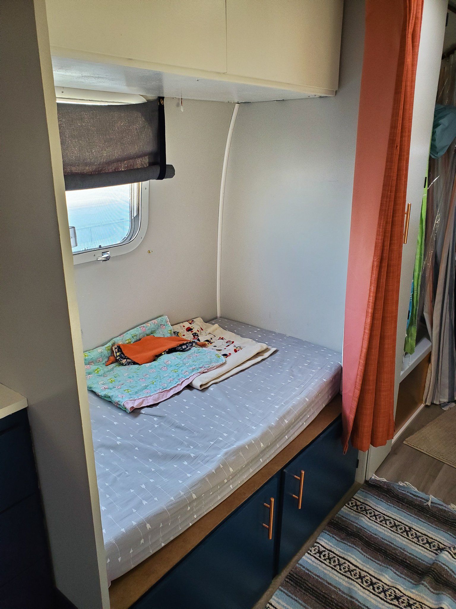 This is it! The Airstream is finished and we are starting to move in! We were on our last day before we needed to get going in order to meet my sister and her family at the Grand Canyon. We’ve been moving in for a couple of days and were just going to finish the last couple of things in the morning and leave by noon so Addie could sleep in the car. Sounds perfect right? Wrong. Well after one of the most stressful moving days which consisted of a bazillion hours, a brand new hitch, and no nap for Addie later… we finally left at 7pm and drove an hour and a half away to a KOA in New Mexcio. We had fast food for dinner, Jon spilled herbal tea all over the floor and we didn’t have a broom or vacuum, and the pantry drawer was falling through. As we finally laid in bed I was so excited to be on the road but we barely slept. It was a new bed for all of us, new noises, new heating, first campground. I remember lying in bed just thinking that surely it can only go up from here… right?