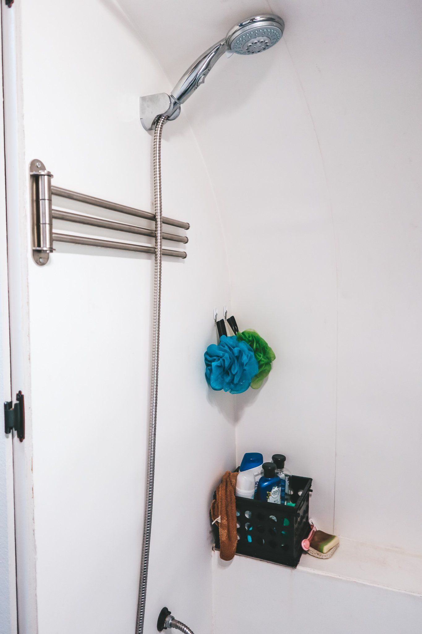 We got this about a month in and it was so necessary. Rather than just having hooks for single towels, we have these rods that can extend. We use these for our towels, swimsuits, and clothes that need to air dry. We placed it on the edge of the shower so that way these items will drip into the shower and can be tucked away and out of the way.