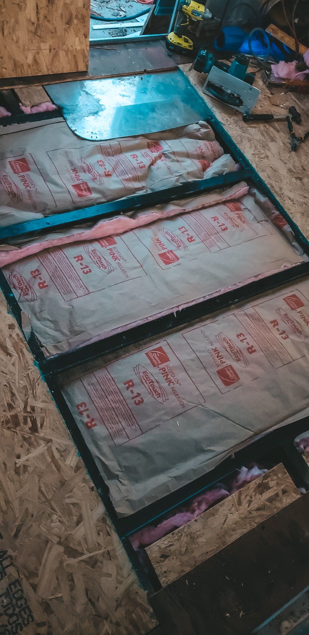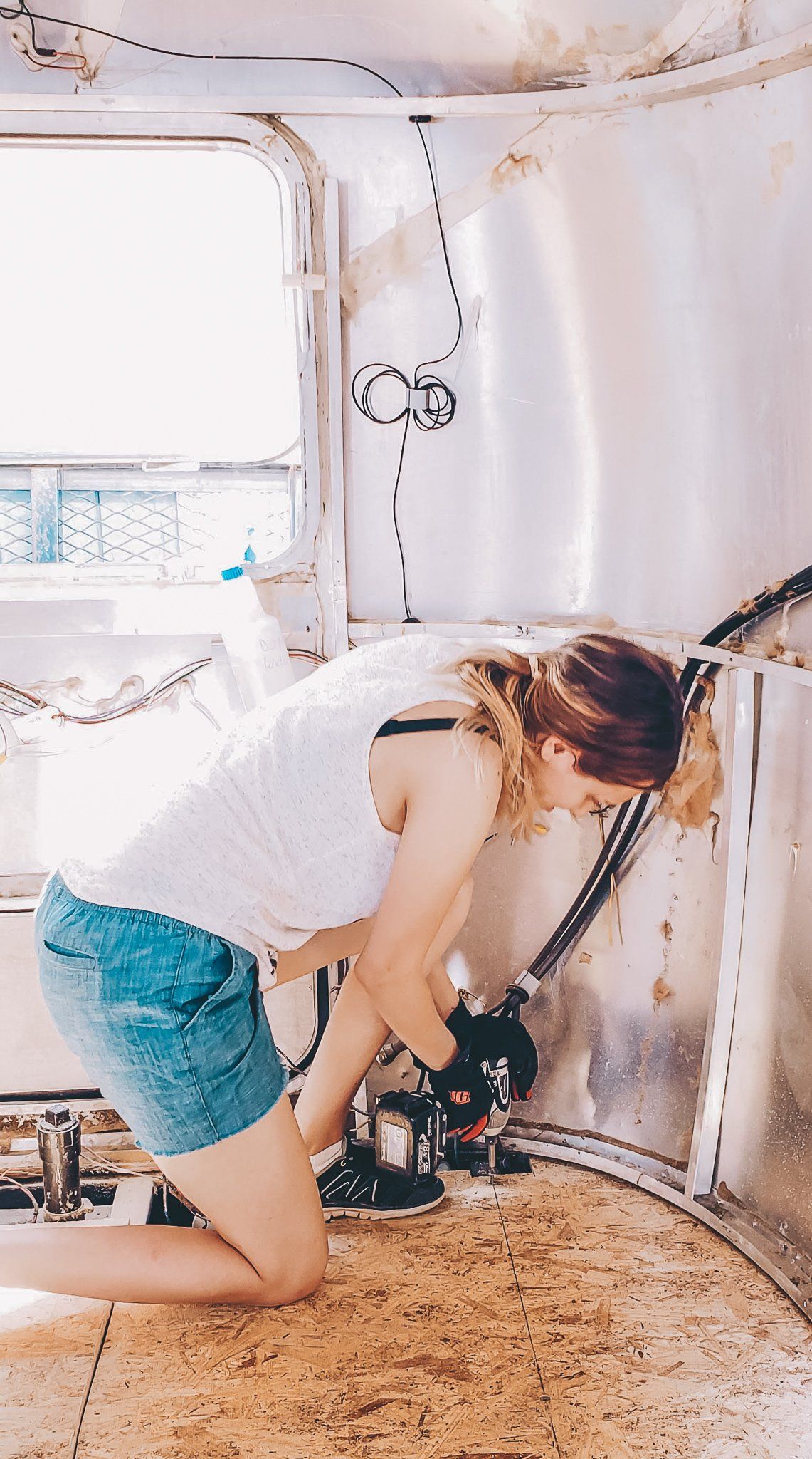 Back in the day Airstreams were built with insulation that was thinner and was sandwiched between the metal support and the subfloor. Modern insulation is much thicker and so we needed to find a way to keep it off the metal underbelly in order to keep that pocket. We used a combination of wiring and stapling. Places, where we could wire across we, would build a wire bed for the insulation to lay on. In the other places where that wasn’t possible, we used a “wacky” stapler (my new favorite tool) to staple the insulation to the bottom of the new sub-floor.