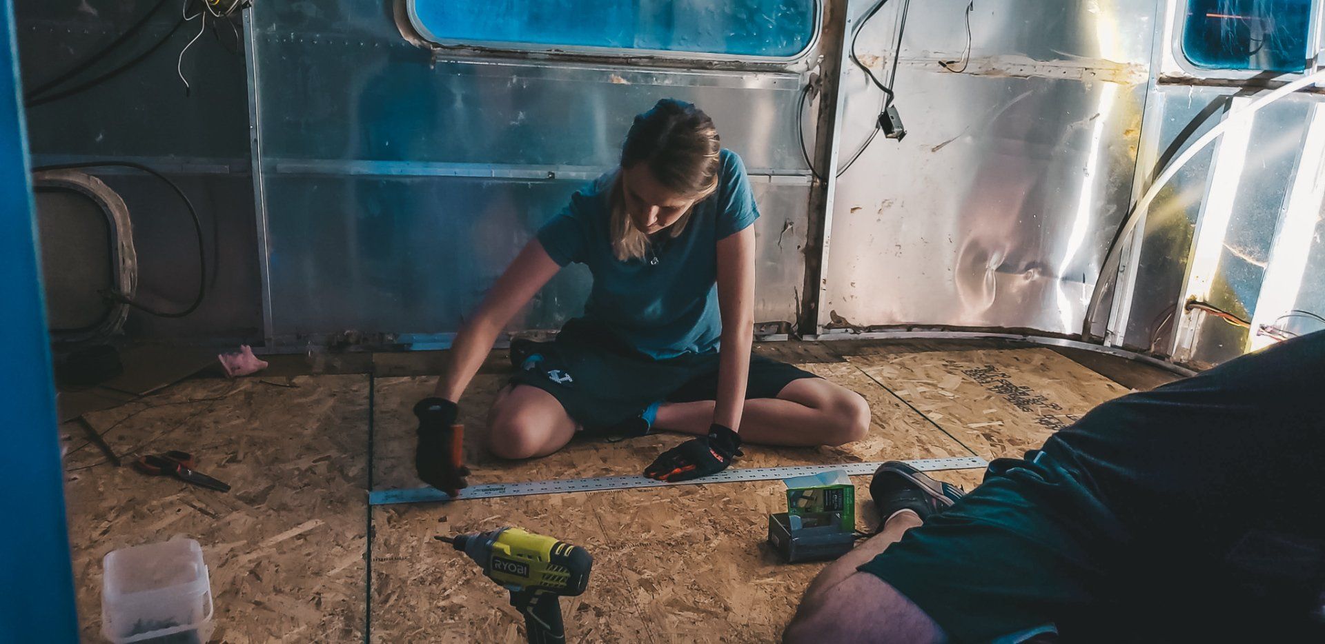 We screwed wood scraps underneath the original wood border that stuck out for us to screw the new floor in to create a seam and offer support. Once those were placed it was time to screw down the floors. We went section by section and I would draw the lines where the metal beams underneath us were. Then Jon would drill and I would follow him and screw it down to the metal frame. Four trips to the hardware store, six drill bits, and two boxes of wood to metal screws later… the floors were DONE!