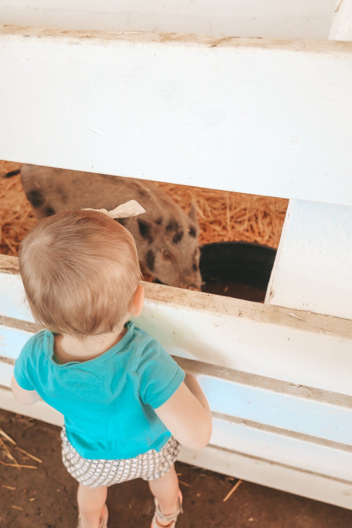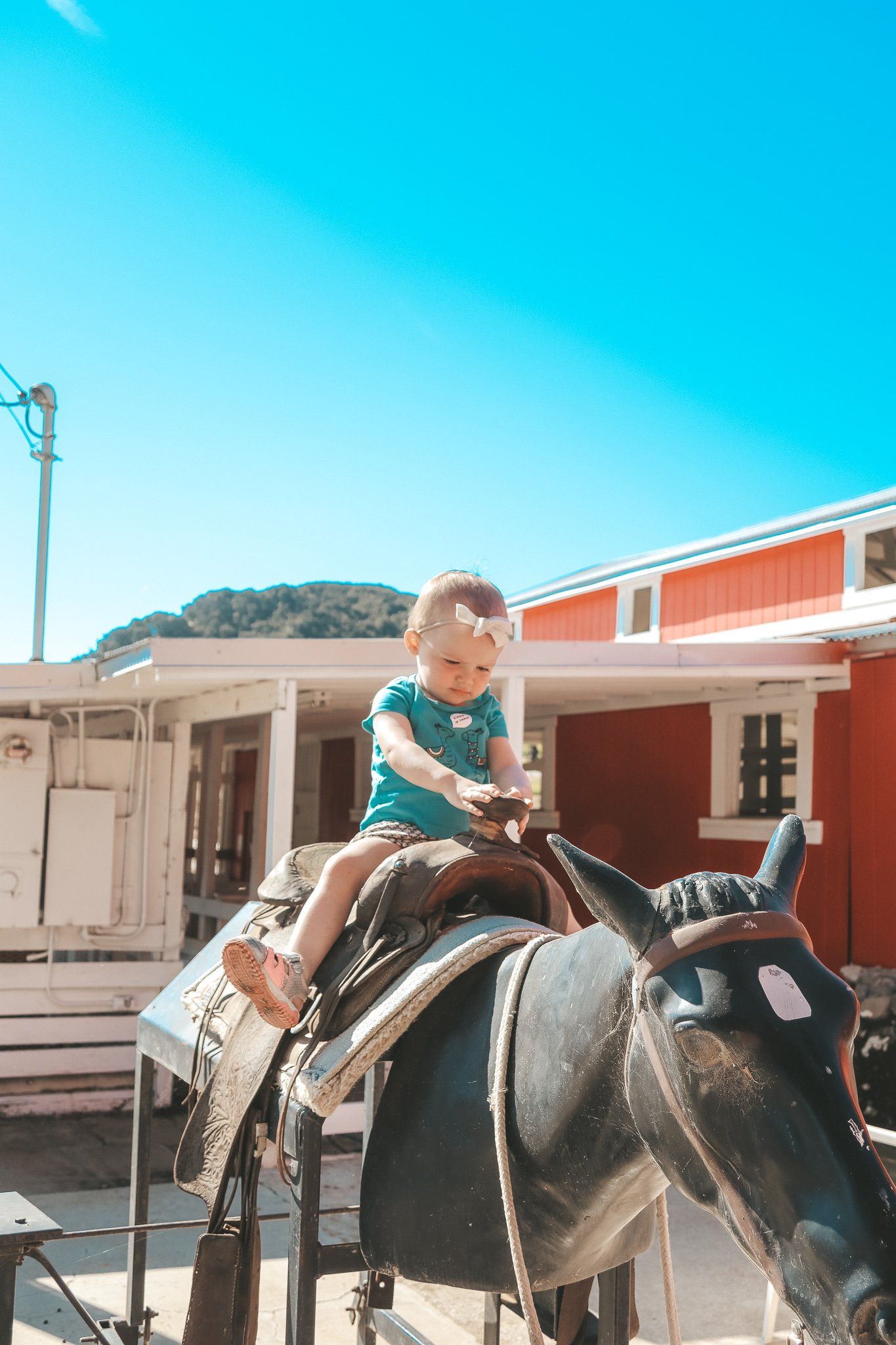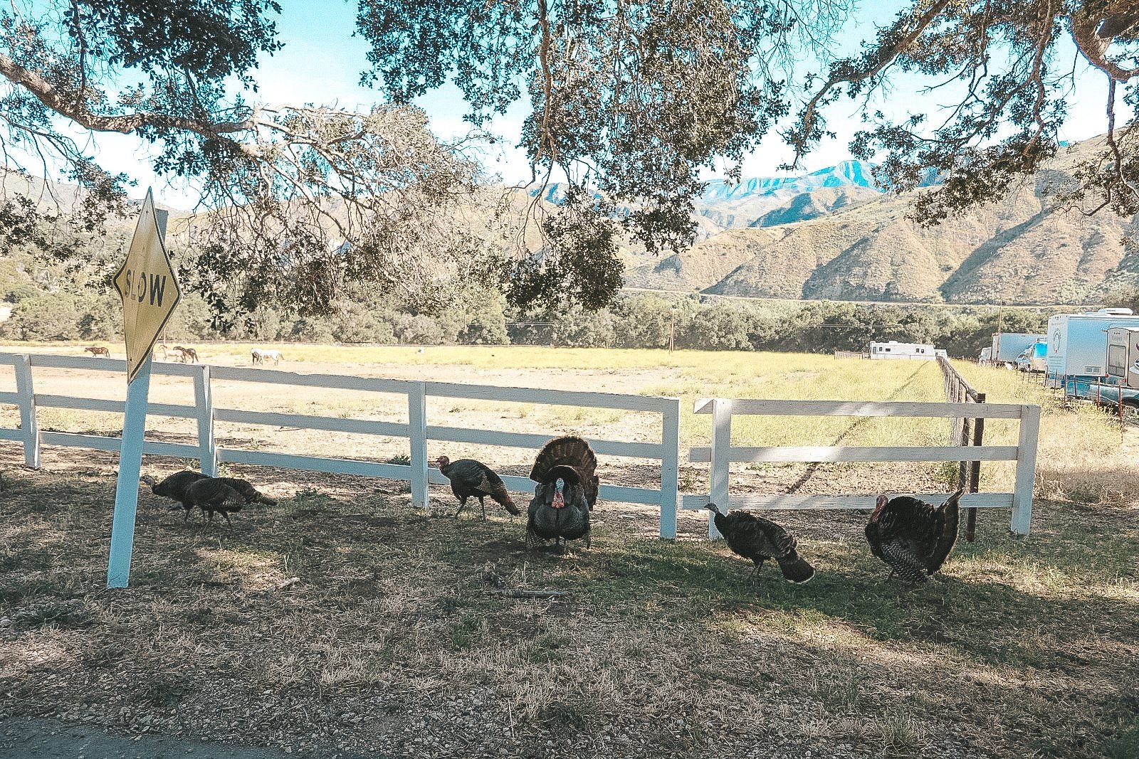 Besides pastures of horses, there are lots more animals! They have a barn area that you can walk around and see all sorts of farm animals! Super fun to take kids to. There are also wild turkeys walking around everywhere. This campground does offer horseback riding but they were all booked out and Addie was too young, but definitely something to look into if you are booking ahead.